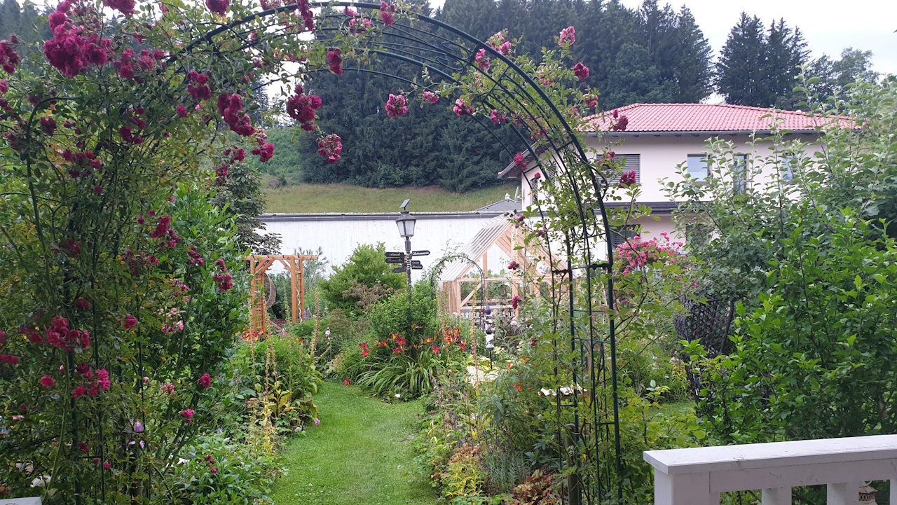 Ein besonderes Highlight sind die zahlreichen Ramblerrosen, die den Zaun, den Gemüsegarten und den Rosenpavillon in allen Richtungen erobern.
